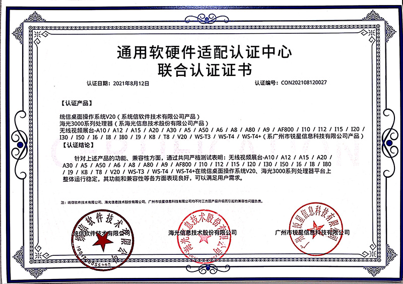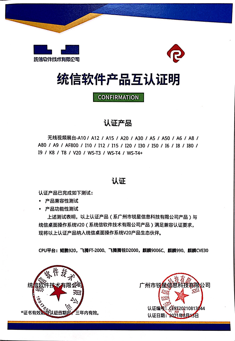日前,由吉星子公司銳星信息科技自主研發(fā)的無線展臺系列產(chǎn)品與統(tǒng)信UOS桌面操作系統(tǒng)V20完成產(chǎn)品兼容性測試以及產(chǎn)品功能性測試。