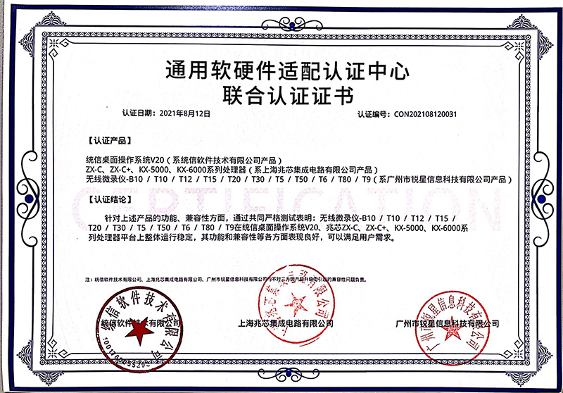 兆芯認(rèn)證證書(展示互動(dòng)寶、無線微錄儀)