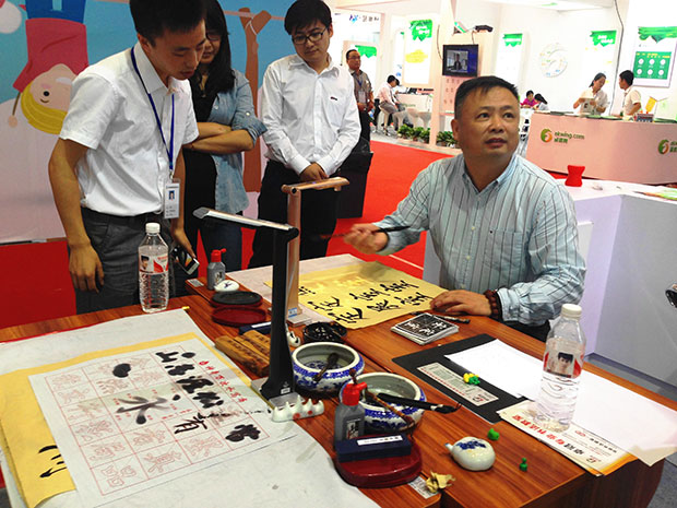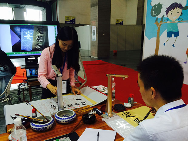 我們模擬搭建的“展示互動書法課堂”是吉星展臺的一大亮點,課堂上老師在無線展臺下進行書法過程展示,畫面通過無線WiFi傳輸到大屏幕,大家可以通過清晰地觀察老師的執筆方式、筆鋒走向和字體結構,進行同步臨摹學習。經過的大朋友、小朋友無不駐足圍觀,躍躍欲試,這么生動活躍的課堂,通過吉星無線視頻展臺這一媒介,將來一定會復制到全國千萬學校課堂去,讓更多的師生從中受益!