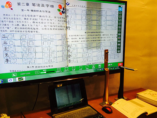 “吉星展示互動書法教學方案”可用于毛筆書法課、硬筆書法課。在書法課上,老師在無線展臺下進行書寫過程展示,清晰地向學生示范書寫要點,同學們通過大屏顯示設備可以清晰看到老師的筆鋒、走向和字體結構。老師可以隨時將展臺移動到學生課桌,或直接調用學生課桌上的展臺畫面,展示學生的書寫過程和書法作品,用對比教學功能進行分屏對比,用白板功能及時講解和批注,增強教學互動性。這個方案稍作變動就可以成為適用于美術繪畫課的“展示互動繪畫/手工教學解決方案” 。
