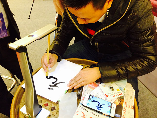 展會上毛筆書法培訓機構在試用吉星無線展臺
