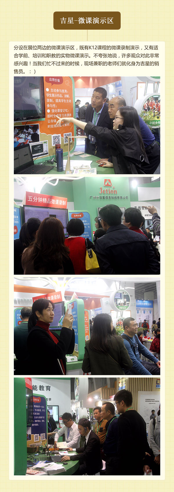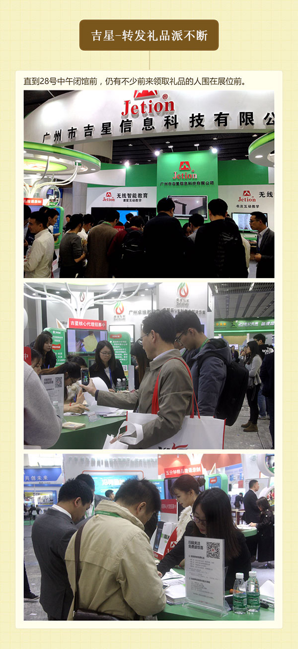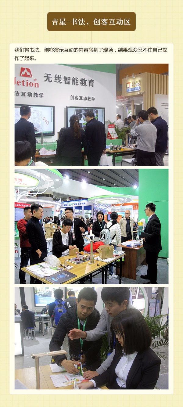 從26號(hào)9點(diǎn)開(kāi)展,到28號(hào)中午11:30閉展,期間,在5.1館A005展位的吉星,帶著無(wú)線視頻展臺(tái)/無(wú)線微錄儀、各種學(xué)科的課堂互動(dòng)應(yīng)用方案、神秘的全新升級(jí)產(chǎn)品、免費(fèi)派送的各式禮包,忙碌著和前來(lái)參觀指導(dǎo)的新老朋友們愉快相見(jiàn)。